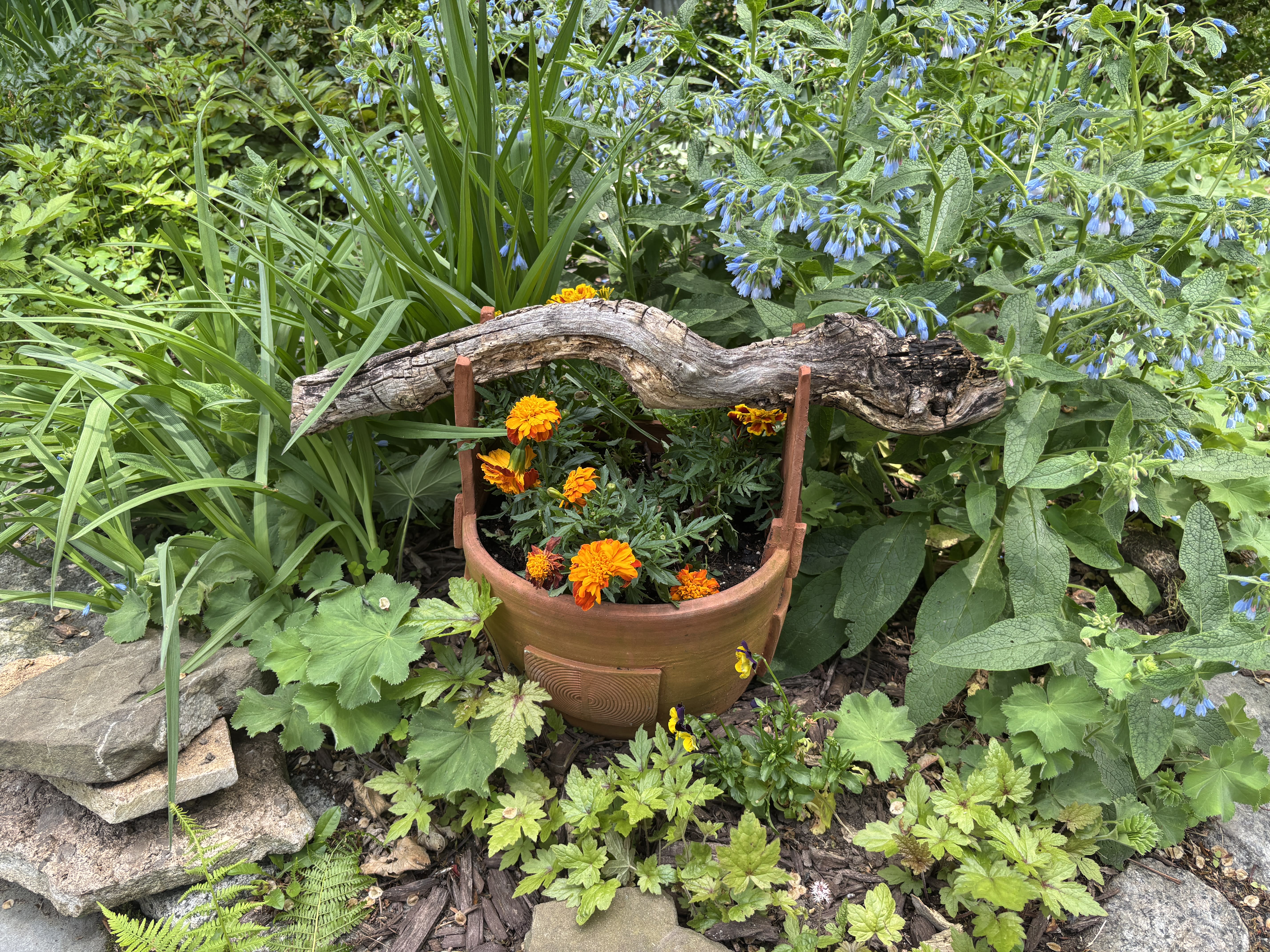 Then, around June 1, I made a stupid move in the garden, resulting in two herniated discs in my lumbar spine. As a consequence, I couldn’t reach up to water the hanging baskets, nor lift them down and put them back up again. So they sat on the porch floor, where I tried to keep up with their care. But it was too much. Some days, even stepping out onto the porch caused more pain than I could tolerate and took more mental energy than I had.