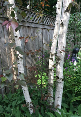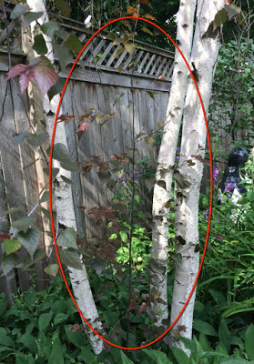 Can you see it? We planted the birch trees years ago. They are now 40 feet tall, but nestled in between? A natural born baby birch tree! Can't see it? Here maybe this will help: