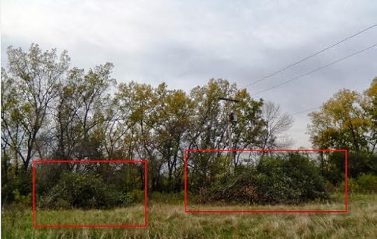 Those piles of greenery inside the red boxes are buckthorn I have cleared from an area along a branch of the Chicago River. Here's proof they are, in fact, dead trees: