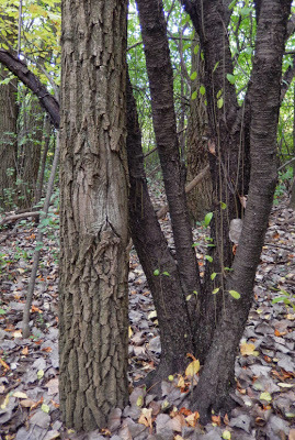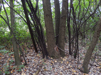 And you can definitely see that happening in this forest. Here's just one photo of many I took showing buckthorn (four thin, dark trunks - probably because it was cut back years ago) crowding around and eventually choking off another tree: