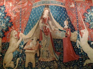 Sorry for the digression, but there is something romantic about Mary's secret marriage in Cluny Chapel, even if she is a Tudor! Cluny has been a public museum since the 19th century and has on display some of the most amazing tapestries I've ever seen, six panels known as The Lady and the Unicorn. They were woven in Flanders in the 15th century, and were rediscovered in the 19th century at Boussac Castle. I was fascinated to learn that the novelist George Sand used her celebrity status to focus attention upon the importance of this find, so in addition to her novels, she leaves another legacy. Tracy Chevalier has written about the creation of these magnificent tapestries in her novel, The Lady and the Unicorn.