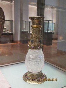 After our visit to the Cluny we headed for the Louvre, which began life as a castle constructed by Richard Lionheart's nemesis, Philippe Auguste; parts of the original wall have been preserved, but the building itself, of course, has been transformed over the centuries. It has been a museum since the late 18th century. Our major objective was to see the beautiful pear-shaped rock crystal vase that was given by Eleanor to Louis after their marriage in 1137. Louis later gave it to his trusted adviser, Abbot Suger, who displayed it proudly in the treasury of his abbey at Saint Denis. George Beech, author of "The Eleanor of Aquitaine Vase" in Eleanor of Aquitaine, Lord and Lady, my favorite book about our duchess, makes a convincing case that the vase was a gift from the Muslim king of the Spanish city of Saragossa to Eleanor's grandfather, Duke William IX in 1120 and that it is of truly ancient origin, possibly crafted in Persia before the 7th century. There is an intimacy about this vase, perhaps because we know Eleanor held it, caressed it, and cherished it enough to give as a wedding gift, and the inscription by Abbot Suger brings us even closer to the "Queen of Aquitaine," as he calls her, the "newly wed bride on their first voyage." It is interesting, too, that Abbot Suger chose to name her as "Aanor," for in her charters, she always called herself Alienor. I'd tried to convince my publisher to let me use this spelling for my Angevin trilogy, but to no avail. I hope Elizabeth Chadwick has better luck than I did!
