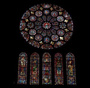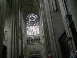 The city ramparts are ancient, too. The first set dates back to Roman times and the second set was ordered and funded by Eleanor. And the city's main street, the Grand Rue, once echoed with the footsteps of Roman legionnaires, then the pageantry of its medieval dukes—and one unforgettable duchess. The churches of Poitiers are memorable, too. The cathedral of St Pierre was begun in 1162 by Henry and Eleanor, the older cathedral razed to make way for the new one; it was in the older cathedral that Henry and Eleanor were wed on May 18, 1152. The magnificent stained glass Crucifixion Window is said to have been donated by Henry and Eleanor, and they are portrayed in the bottom panel of the window. So our visit to the cathedral was special to all of us.