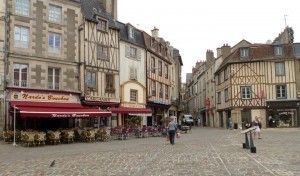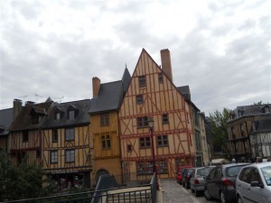 Our walk through the Cite Plantagenet was an absolute delight—cobbled streets and half-timbered houses, more than a hundred of them. Le Mans has begun to restore the original colors of these medieval houses, vivid reds, greens, and blues. People don't always realize how colorful the Middle Ages were. Seven of these houses are decorated with bright corner pillars, one way of identifying locations, for all streets did not have names and none had numbers; if directions referred to the "red pillared house," the inhabitants had a point of reference—rather clever, actually.