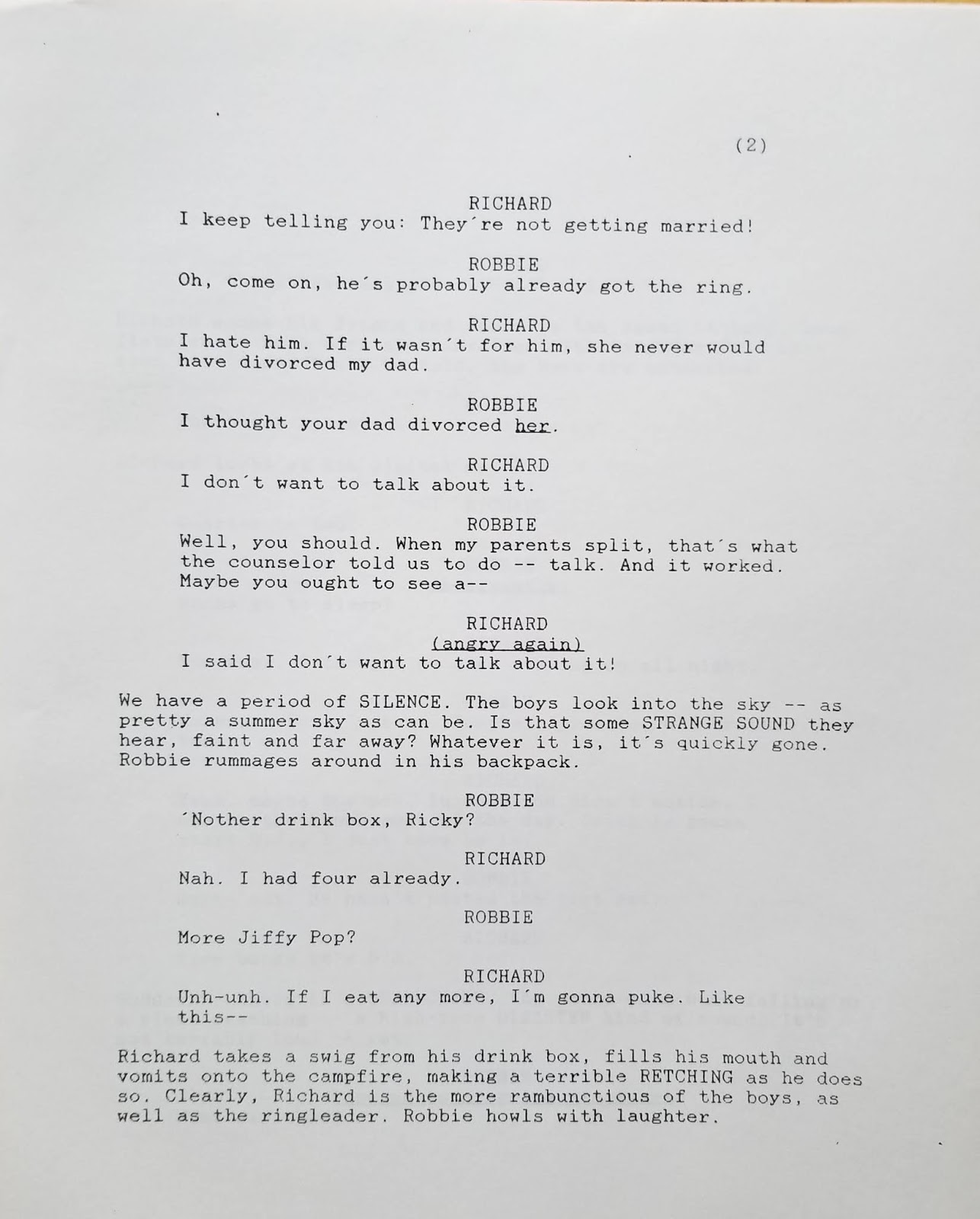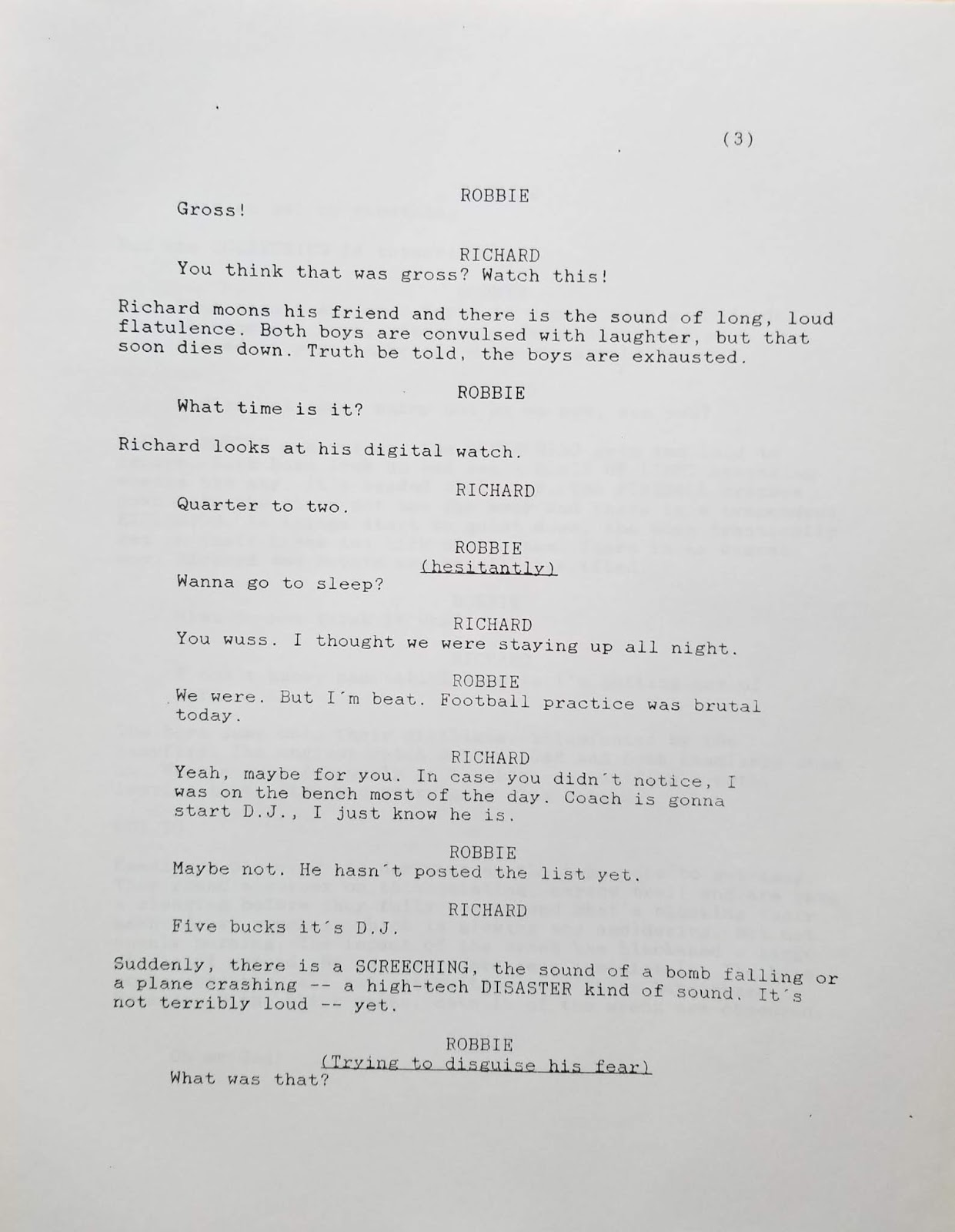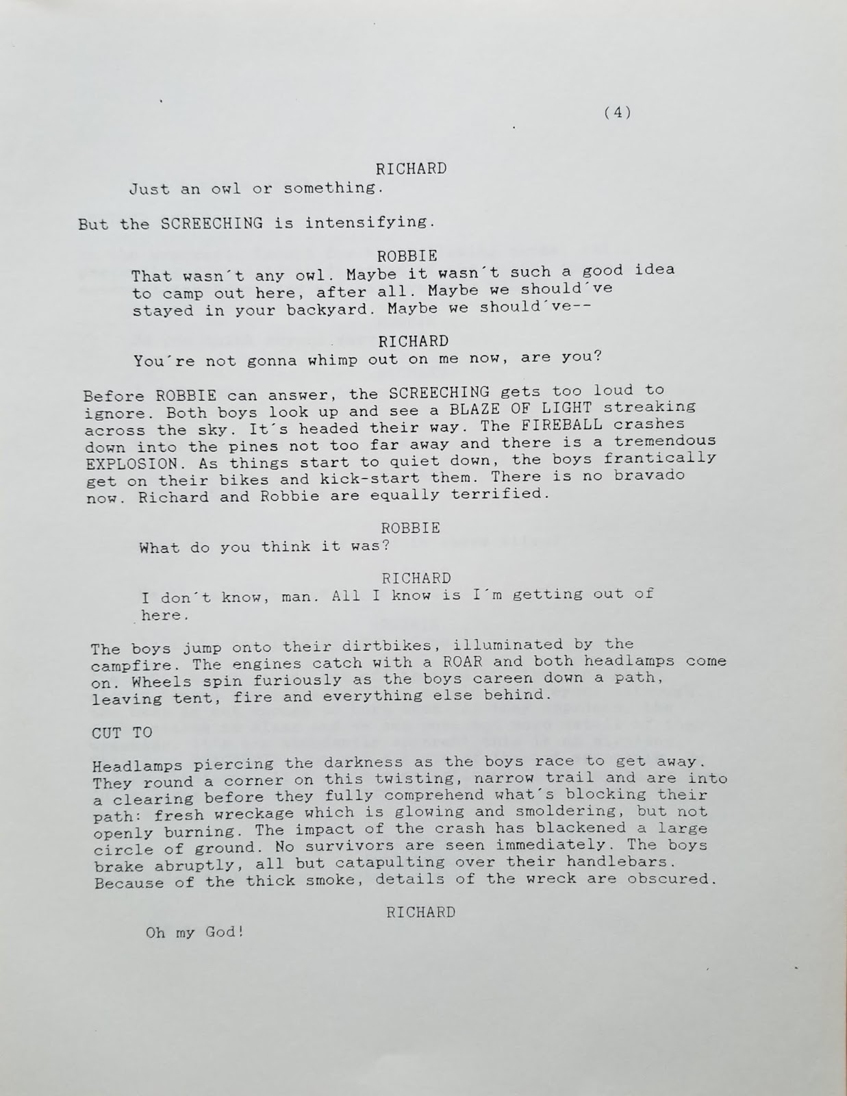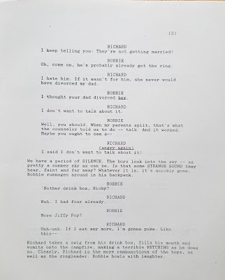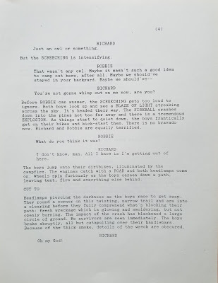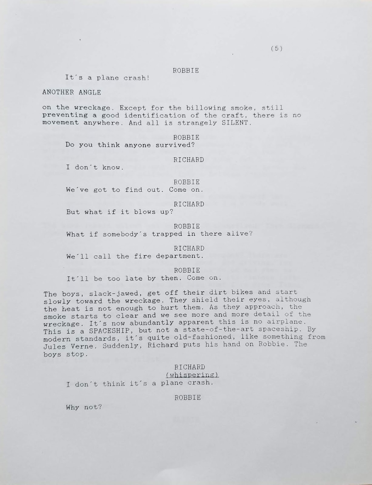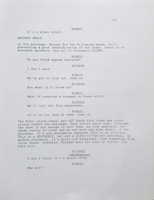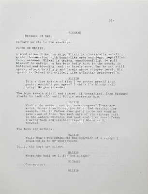 And humor me as I open the old writer’s trunk to reveal another screen project, much older than “Since the Sky Blew Off” – a completed full script for “Wishers,” which I completed more than a quarter of a century ago. Less dystopian than pure science fiction, it has flavors of early Spielberg. Herewith the first six pages. As you can see, this is literally from the trunk: