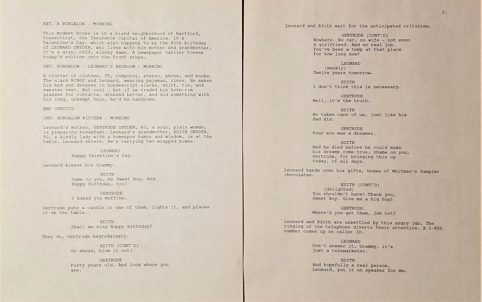 LEONARDWho wants some customer service now?(beat) Oh I’m fine thank you. Thank you fornot asking, ma’am. May I call you ma’am?Thank you for being just like every other barely literate fool who has called over the past 17 years to dump your problemson us… Hello?