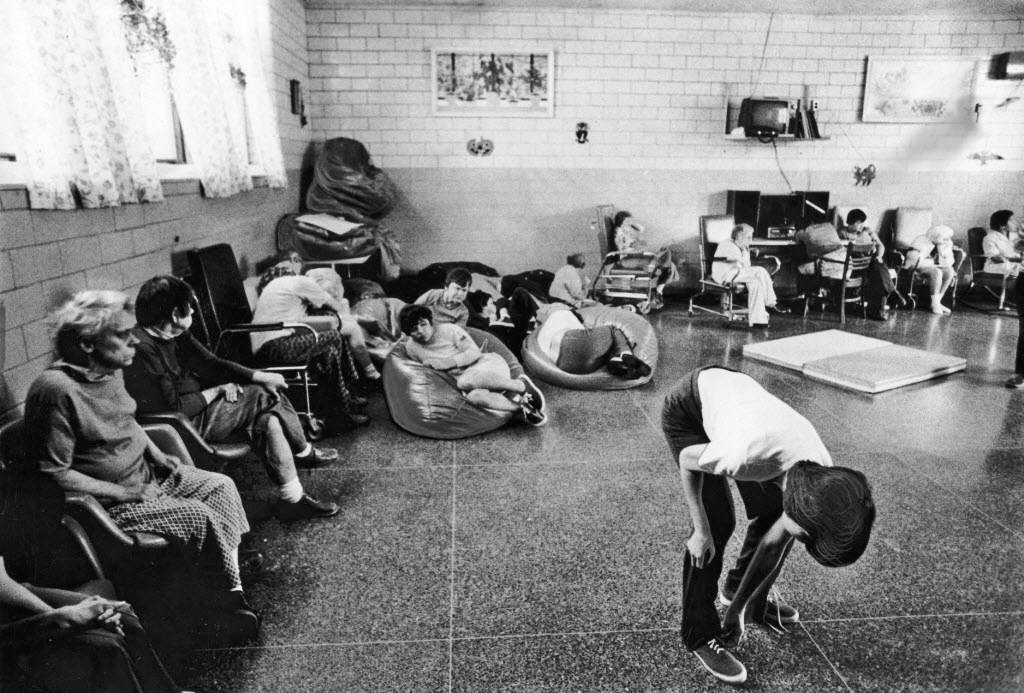 In the day room, a couple of patients are exercising, stretching their arms, bending over to touch their toes. Mild, all of it.