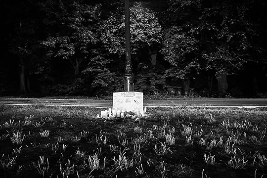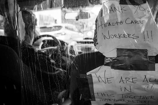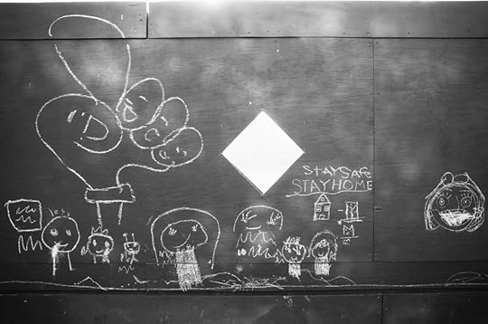 Throughout all of Chiu’s black-and-white photographs is a subdued, contemplative atmosphere. At times, there is an overwhelming stillness, which extends into her accompanying video pieces (the only components of the series in color). Although the reality Chiu captures is familiar, viewing these works gives a similar sensation to flashes from a dream or memory. Fog overtakes a surreally empty Brooklyn Bridge. A trio of children, almost completely lost within the frame, peek out the window from behind protective bars. Chalk squares indicating social-distancing guides are spread across a concrete courtyard—a sight that would have been almost incomprehensible a year ago, but is immediately recognizable today. A candlelit sign reading “Vigil 4 Martyrs of the George Floyd Rebellion” sits quietly at the center of a frame, illuminating the dark background.