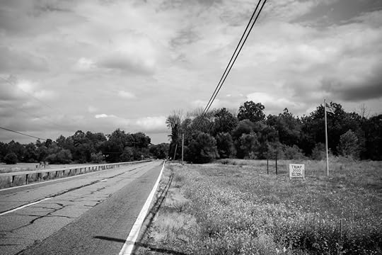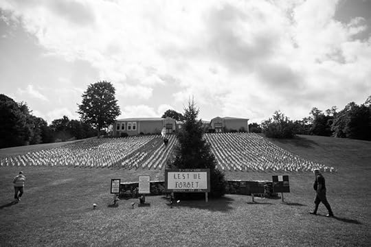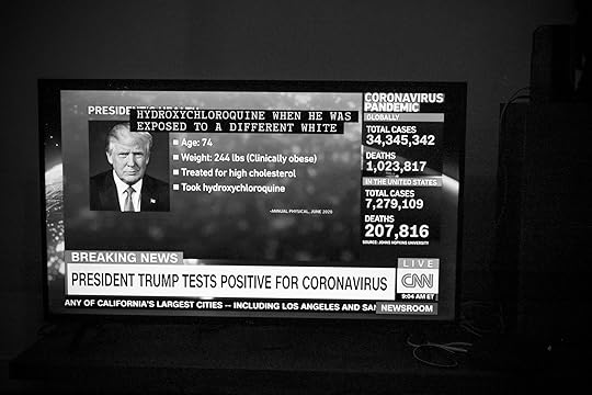 In one frame, posters of Black men, women, and children who have been killed are displayed across a fence, a dried bouquet between them. In another, the news splashes across a TV screen, floating in a darkened room. Signs of the pandemic become, at once, both messages of separation and reassurances of solidarity. The American flag, in particular, is a recurring symbol throughout the series: from a sweeping field of them at a 9/11 tribute in Stanford, New York; to those held during protests with the words “Black Lives Matter” written across them; to flags ominously standing next to a “Trump 2020” sign in an empty field.