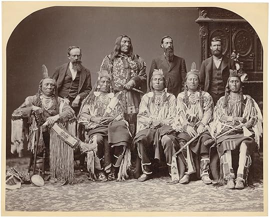 Charles Milton Bell, Studio portrait of Apsáalooke (Crow) delegation, 1880. Front row, left to right: King Crow; Medicine Crow; Long Elk; Chief Yshidiapas or Aleck-Shea-Ahoos, called Plenty Coups (Many Valorous Achievements in Battle with the Coup Stick); Pretty Eagle. Back row, left to right: Addison M. Quivey (interpreter); Two Belly; Augustus R. Keller (agent); Thomas Stewart (interpreter). Apsáalooke men wear traditional clothing, including fringed and beaded hide shirts and beaded necklaces, and some hold tomahawks and fans. Interpreters and agent wear suits.