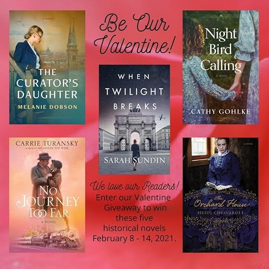To enter our Valentine’s Day Giveaway, just fill out the Rafflecopter form below. You will need to copy and paste the links for each option. One winner will be chosen at random on February 15 to win paperback or hardback copies of all five books. This contest is open to US and International readers. Thank you for being a faithful reading friend! Do you have a friend who loves to read historical novels? Please forward this giveaway and share the love!