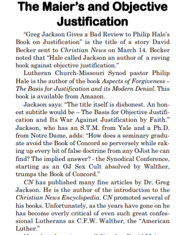 I will send a finished copy to the cub editor of Christian News , so he can assign a review to someone suitably addled from reading the omnia opera of the Objective Justification salesmen.