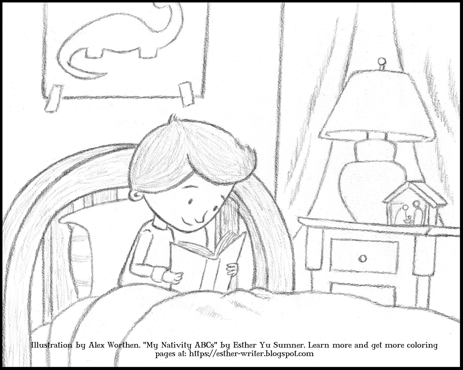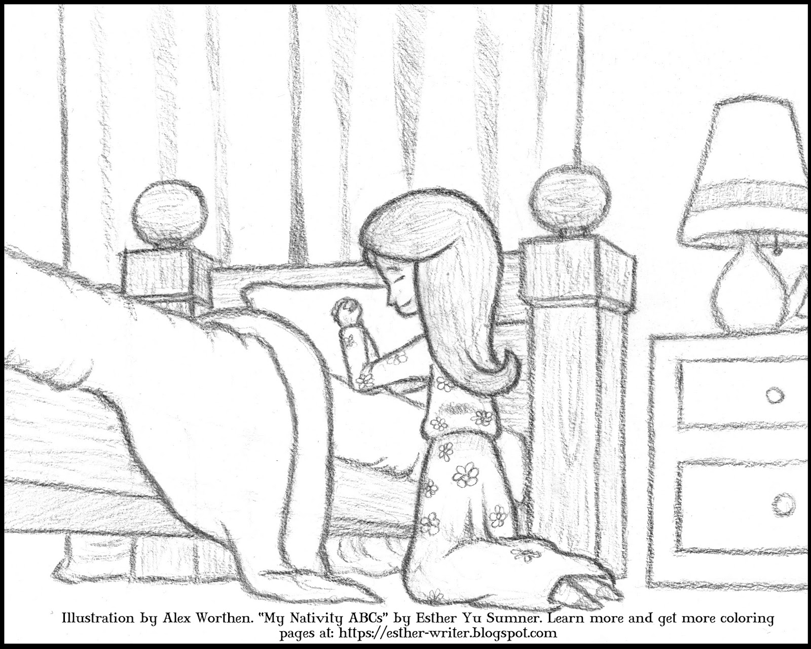 This coloring page is from a "cut" scene from "My Nativity ABCs," by Esther Yu Sumner (me). My publisher, Cedar Fort, decided they wanted all of the imagery for "My Nativity ABCs" to be scenes from ancient times instead of combining the imagery with contemporary scenes. So, as much as I loved artist Alex Worthen’s original interpretation of the “Q” line from my alphabet nativity story, it had to go. I really love what he did with it instead, but I'm pleased that he was willing to share this drawing as a free coloring page instead. Look at the little nativity on the nightstand! You’ll have to read “My Nativity ABCs” to find out what “Q” stands for but for now, I hope you enjoy this free coloring page.