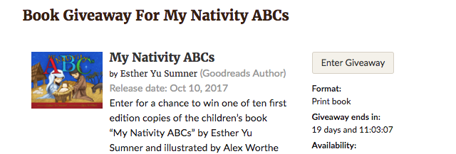My Nativity ABCs by Esther Yu Sumner Giveaway ends November 20, 2017. See the giveaway details at Goodreads. Enter Giveaway