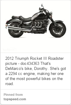 I did my homework on large motorcycles before selecting this one for a secondary character. DeMarco leads a group of biker mages, and has to show he is big and bad enough to do so. The Triumphs are some of the most powerful bikes on the road, and this one is top of the line. And it gives me a visual for when I think of him on Dorothy (his bike is named for Dorothy Dandridge).