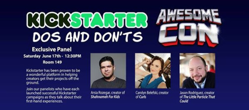 On Saturday June 17th @ 12:30PM I’ll sit with Arsia Rozegar and Carolyn Belefski to talk about my experiences with Kickstarter, primarily with my recent project THE LITTLE PARTICLE THAT COULD. This board book about particle physics (written by me, illustrated by Noel Tuazon, colored by Rob Croonenborghs, lettered by Jason Hanley, and with a cover by Dylan Todd) was originally asking for $4.5k and went on to raise $11.5k. I’ll be talking a lot about the marketing I put into the project, scaling to well above my expectation, and fulfilling rewards, I’m sure.