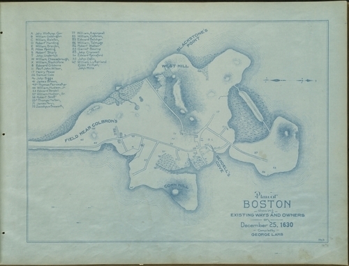So many wonderful, wonderful maps. The one above is the original plan of Boston from 1630. I love how it points out who will own what lands. Winthrop gets top-billing, of course.