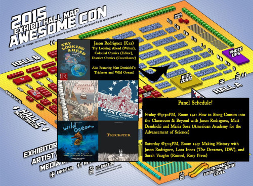 Will you be at Awesome Con this weekend? So will I! Table K12 with TRY LOOKING AHEAD, COLONIAL COMICS, and DISTRICT COMICS. I’ll also have Matt Dembicki’s TRICKSTER and DISTRICT COMICS! And I’ll be on two panels, “Bringing Comics into the Classroom and Beyond” on Friday at 3:30PM (room 141) with Matt Dembicki and Maria Sosa and “Making History” on Saturday at 3:15PM (Room 143) with Lora Innes and Sarah Vaughn. On Friday Matt will be hanging at my table and on Saturday Colonial Contibutor Matt Rawson will be hanging out with me. I have no-one to hang with me on Sunday, yet but who knows…maybe I’ll find a friend.