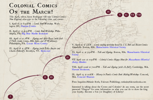 Announcing the Colonial Comics: New England, 1620-1750 April 2015 tour! We’ll be in Washington DC (Fantom Comics, fantomcomics), Philadelphia (Big Blue Marble Bookstore and Locust Moon Comics, locustmooncomics with James Comey, Josh O’Neill, msgier, and JT Waldman), Brooklyn (Bookcourt with erikaswyler and giantearthpress), Boston (the Massachusetts Historical Society with J.L. Bell and the Boston Comics Roundtable), Cambridge (Harvard Bookstore with J.L.Bell), and Concord (the Concord Museum). Workshops, talks, signings, special guests, and fife playing through the streets! Check the map for dates and times!