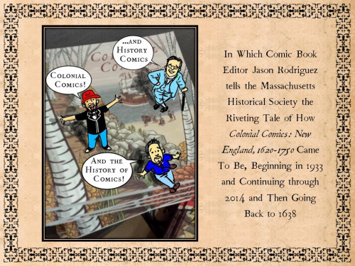 Title slide for my 4/21 talk the Massachusetts Historical Society. And at the Happy Hour afterwards, we WILL be making an exquisite corpse comic. Please RSVP at the link (http://www.masshist.org/calendar/event?event=1520), because space is limited!