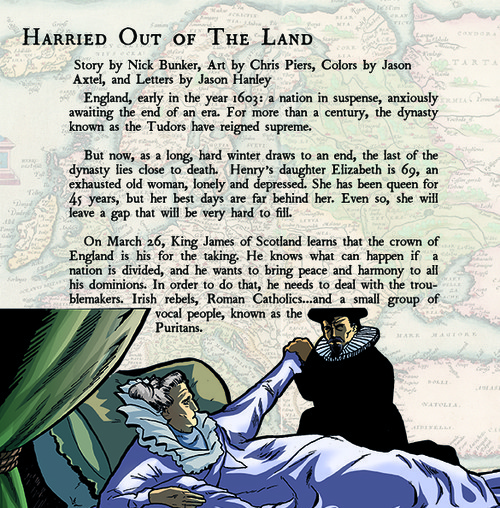 The first story starts in England in 1603. This may seem like it’s outside the confines of the book, but any story about the British colonies has to start in England, with the death of Queen Elizabeth.The story was written by Nick Bunker (Making Haste From Babylon: The Mayflower Pilgrims and Their World: A New History, An Empire on Edge: How Britain Came to Fight America) and features pencils and inks from Chris Piers (Trickster and frequent author/illustrator for The Robot’s Pajamas), colors from Jason Axtell (Mr. Big), and letters by Jason Hanley (Elk’s Run, Postcards: True Stories That Never Happened).