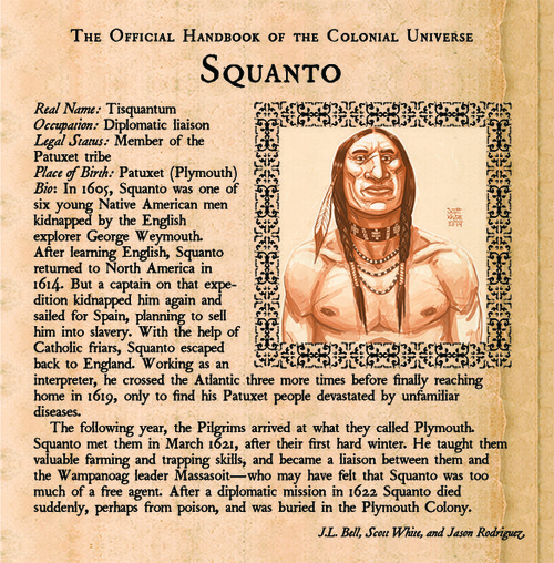 'll be at ALA Las Vegas at the end of the month with some previews of Colonial Comics Volume One, four Colonial Characters trading cards (mock up of the Tisquantum card attached, these aren't final yet, illustrations by Colonial Cover Artist Scott White) and, if all falls into place, a near-complete digital copy of the book. I’ll also have some TRY LOOKING AHEAD promo with me, obviously, including a TLA paper fortune teller for the kiddies.
