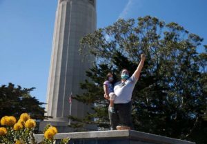 Mariposa Villaluna at Coit Tower after a crew from the city dismantled a statue of Christopher Columbus during the night. Photo: Paul Chinn / The Chronicle