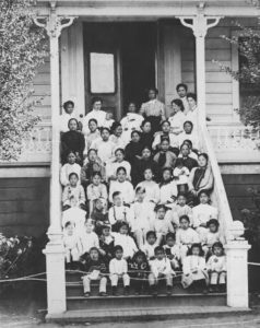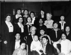 Donaldina Cameron (center, with toddler on lap) surrounded by Mission Home workers, who were early anti-trafficking activists. Courtesy of Cameron House.