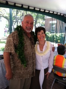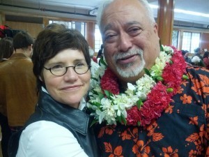 Patrick Makuakane, the hulu kumu of San Francisco’s well known Na Lei Hulu troupe was also at the party to pay his respects to Ka’ala. He was one of a large number of people who waited in line to greet and thank him.