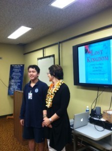 Julia Flynn Siler, author of “Lost Kingdom” (left) and Carlton Ka’ala Carmack, Hawaiian music teacher (right) in Dec. 2012
