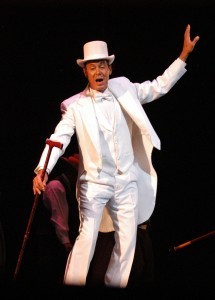 One colorful character I’d never come across before was Ioane “Daddy” Ukeke, a character played by Mark in an all-white three piece suit and top hat. Iolane apparently got his name because of his skill in playing the native Hawaiian stringed instrument, the ukeke. He was also the leader of a hula troupe that often played for King Kalakaua, according to the program notes. But Ioane’s fortunes mirrored those of the Hawaiian monarchy: he went blind and ended up playing his ukeke in the streets of Honolulu in hope that a passerby might drop him a coin or two.