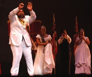 Having seen him and members of his halau (hula school) perform their high-energy hula in the course of reporting that story last fall, I was happy to attend “Kingdom Denied: Between the Lines” at Chabot College in Hayward last weekend. This ambitious and, at times, very moving rendition of the rise and fall of Hawaii’s last king and queen was well worth the trip.