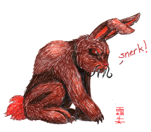 Scarlet FrostThat's my boy right there, once he decides he wants a story told, he doesn't let up until it's done, even if it takes a couple years for it to go from plot bunny attack to actual words on paper. And he's a genius at getting the muses involved with their underhanded tricks. But no, that wasn't the bunny that visited me Sunday night. The one that woke me up at 3:30 in the morning and left me awake at least for an hour. No, that was this ugly bastard.Freaky isn't he?