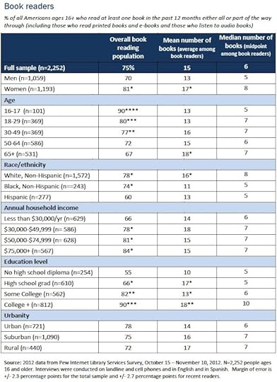 There are two additional charts on the Pew Research page that give detailed breakdowns of the demographics within the above numbers, and some of these are quite enlightening as well (useful for authors to know how and where to promote their work).