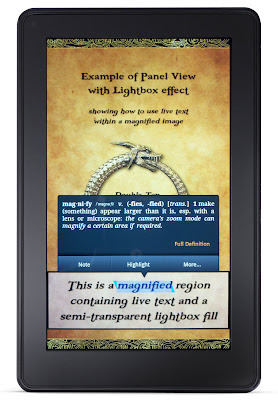 In this installment I'll show you how to zoom images in KF8 fixed layout ebooks using a few important variations on the code used to create text mag targets (discussed in the first part here), as well as how to add a lightbox effect to dim the background surrounding the magnified area (as seen in the image on the left), and within the magnified region itself as a semi-transparent fill. In addition, I'll discuss the elements that allow you to include live text overlays on top of both the full screen and zoomed images.
