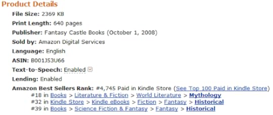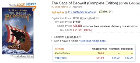 Odd as it may seem, my sales actually increased after my first "free" promotion last month, which ran for two days. During the promotion The Saga of Beowulf hit number 1 on the Top 100 Free ebooks in both the U.K. and Germany, and #2 in France, while peaking out at #36 here in the States. I gave away just under 2000 copies in two days and got a lot of free promotion, some new reviews, and (one can only hope) a broader fan base. But the real surprise came in the subsequent weeks, when the title continued to hover in the upper thousands range in the overall ranking for Kindle ebook sales, rather than it's usual location down around 20,000 or so.