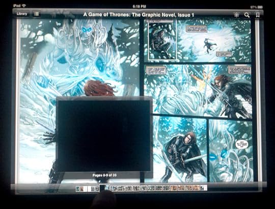 This is when I started to wonder whether it was in the code at all. Probably I should have done this sooner and saved us both a lot of headache (which is the point of this post), but I loaded in the Game of Thrones graphic novel shown above, and as you can see the same thing happened. After only a few scrubs back and forth the thumbnails turned to black and the covers went away. I should mention here that the thumbnails and images all load in just fine at first, so if you're reading like a normal human being and not a manic ebook builder you'll likely never notice this. In fact, this is an inconsistent problem to some degree, which does not always affect the same pages, either in different books or the same book on different devices - or even on separate viewings of the same ebook - although the same pages do tend to break more often, while others do not. For example, in David's picture book he had only two thumbnails go blank consistently while I had all but two go black on the first viewing, and then none at all the second time, even though I roughed it up by playing on the scrubber bar like Mozart on a drunk. Conversely, I could never get his cover images to disappear, although not only does the Game of Thrones cover go missing on both my iPads, but the inner cover does as well.