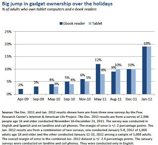 Secondly, the rapid decline in the retail cost for entry level e-reading devices last year, combined with an increase in availability and options, led to what can only be deemed a tablet boom this past January when, according to recent Pew Research survey results, device ownership nearly doubled in a single month, from 10% of adults to 19% - for both e-book readers and tablets. One can only surmise the vast majority of these were Kindles purchased as gifts at their newly lowered price point, and from reported estimates, some five million Kindle Fires. These new sales figures also tell me that a great many of those devices purchased over the holidays were at least in part intended to be used for entertaining and educating children, something not even possible a year ago for a large part of the current market.