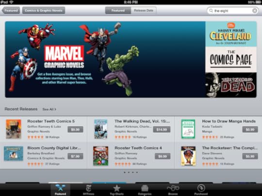 There is a new section in the iBookstore devoted to comics and graphic novels. This is a big improvement and highly useful for anyone who's tried to find titles in this genre amidst the mess that is the iBookstore - one of the most user un-friendly retail environments ever devised, which had made it almost impossible to actually find graphic novels before now (unless "Graphic Novel" was in the title). There are now subcategories for Graphic Novels, Comics, and Manga, which include some 1500 publications from the likes of Disney, Marvel, and Random House.