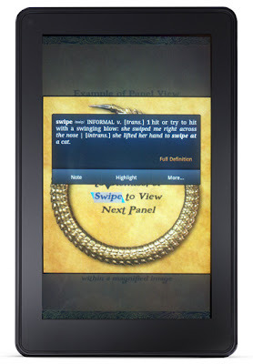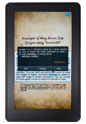 Well, the KF8 story just keeps getting stranger by the minute it seems. What is this picture at the left, you might ask? What you're looking at is my KF8 Fixed Layout template with live text!!! Zoomed, highlighted, search capable, and dictionary functional - even within the magnified region!