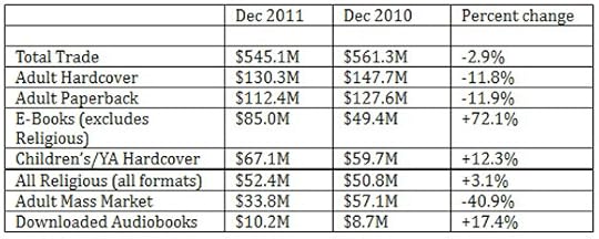 The answer seemed to be to give them something else instead (such as the e-Reader itself), since print sales hardly made up the difference in digital's "meager" showing (virtually every other month of 2011 showed at least a 100% increase, with February breaking 200%). While all major print categories were down, the Children's/Young Adult Hardcover segment put in a strong showing, with a 12.3% increase over 2010. I guess we know what kids got for Christmas this year. Adult Mass Market fared the worst, with a 40.9% decline from $57 million in December 2010 to just $33.8 this year.