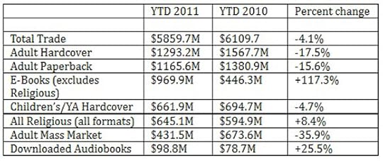 Turning to overall Year-To-Date sales, all print segments saw losses for the year, with Adult Mass Market down the most by nearly 36% over 2010. Both Adult Hardcover and Paperbacks saw double-digit declines, and even the buoyant holiday winning Children's/YA Hardbacks sector lost almost 5% on the year. Overall, Trade sales fell for the year by just over 4%, with ebooks coming in at a respectable +117.3% - down from its one-time cumulative high of 162.9% in April.