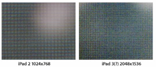 This is a nice microscopic shot of the iPad 2 screen compared with what is purported to be coming next week with the iPad 3. As you can see, the amount of detail provided by the higher resolution pixel depth is quite astounding in comparison, with four times as many bits of information in the same amount of space.