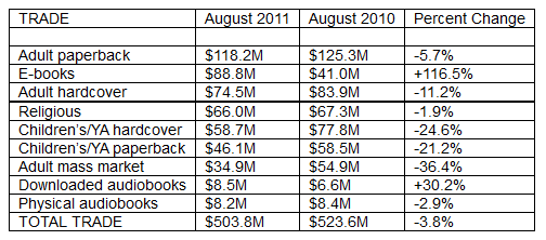 And this got me to wondering just where eBooks stood as a percentage of that market. For 2010 the general estimate was that eBooks made up somewhere between 12-15% of total book sales for the year (the numbers are always a bit dodgy, since a lot of figures aren't reported, such as self-pubbed books and those from smaller independent publishers). Doing some quick math you'll see that eBooks' $88.8 million take for August comprises 17.6% of the pie. Discounting audio and comparing digital to print alone brings eBooks' slice to 18.3% for August.