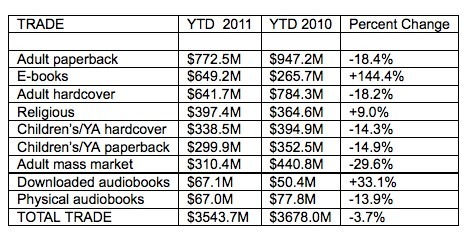 Looking at the Year-To-Date numbers for 2011 relative to 2010 you can see the cumulative result: every print division is down by double digits, save Religious titles, which show a moderate gain. More importantly, eBooks have seen an increase of 144% since the first of the year, from $265.7 million to a whopping $649.2 million, making it the second largest segment of the book market overall, behind only Adult Paperbacks. Of course, "eBooks" includes the digital equivalent of every one of the other categories, so it's not a direct comparison of, say, print Adult Paperbacks to digital Adult Paperbacks. Also bear in mind these figures don't take textbooks into account. But as a segment of the general book trade it's a substantial chunk.