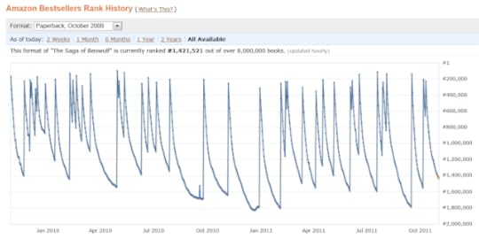 Above is a screenshot of the print book sales of my first novel The Saga of Beowulf on Amazon, over the course of the last two years. The book came out in October of 2008, but Amazon's sales tracking in Author Central only goes back this far. This accounts for some 50-60 sales in nearly two years, at least one spike of which is six books purchased by a friend of mine for clients. Initial sales after the book's launch were higher and more consistent for the first six months while I was promoting it heavily, and these are all residual sales achieved well after the fact with no additional promotion other than this blog and my website. Certainly nothing to make a living from, but at a list price of $14.99 for a 640 page historical fantasy novel by an unknown author, it's not surprising.