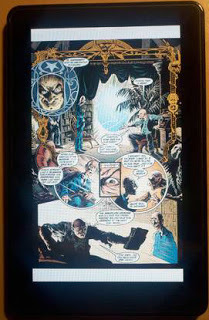 Related to my prior post is the news that these and other KF8 formatted graphic novels would soon be supported on other Kindle devices and apps. Currently you can only view the new editions on the Kindle Fire itself, but once the KF8 format is rolled out across the Kindle ecosystem these new ebooks will load and sync on all your Kindle readers, whether that's an Amazon device or not. KF8 is not yet supported on the iPad 2, for example, even though the capability is clearly there.