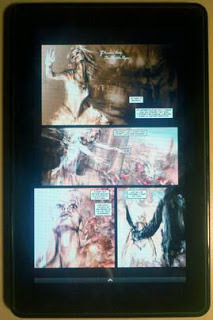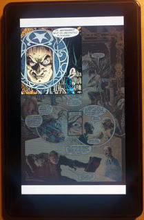 At left is a shot of a full panel of Sandman in the Kindle Fire's native reader. Colors are clear and vivid as expected, but the 7" screen presents text that is much too small to read. The problem is exacerbated by the fact that both pinch and zoom and horizontal orientation have inexplicably been turned off for both the titles I downloaded, so that the only way to enlarge the text is via KF8's version of Panel View. This renders graphic novels much the same way the Fire handles magazines, which is to say not well. Pinch and zoom has reached the point of being virtually synonymous with "touchscreen," so that its absence here is truly perplexing. In addition, pages load at annoying slow speeds in the Kindle Fire's reader, so that I found myself constantly swiping twice to turn a page, thinking it hadn't registered my first motion.