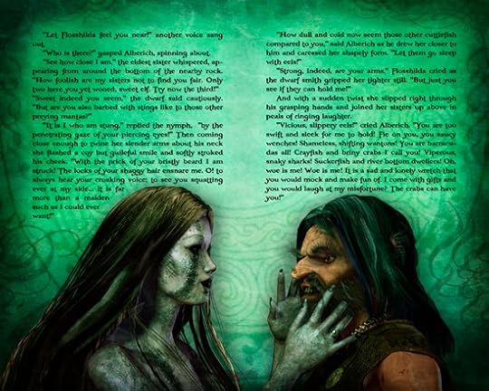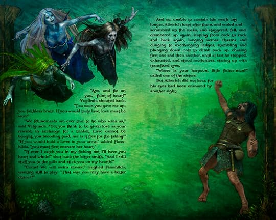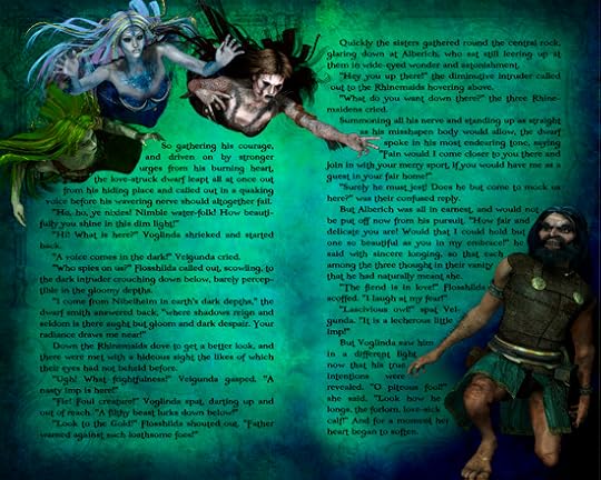 The story at this point follows Wagner very closely, and I have attempted to retain as much of his wit and humor as possible. Many of the Rhinemaidens' lines are direct translations from the original German libretto. As mentioned in the previous post, I have veered off slightly on my own with regards to Alberich's intentions and motivation. Here I have developed that somewhat further, to the extent that I have given our dwarf a clear initiative: in the opera it is left at best a bit muddled and unclear how this interaction actually begins. Additionally, Voglinda's tinge of optimistic curiosity is entirely my own invention.