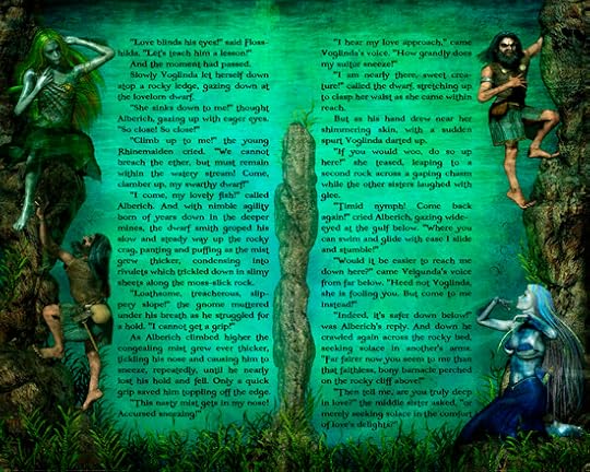 As far as the story goes, this is the segment I refer to as the "Rhinemaid Seduction Sequence," in which our poor dwarf gets the runaround from all three sister nymphs, as they tease and taunt him mercilessly until he's nearly fit to be tied. By the way, I'm also writing this as a filmscript as I go, so hopefully one day we'll see it on the big screen. Unlikely, but you never know. This particular scene would be a lot of fun to watch.